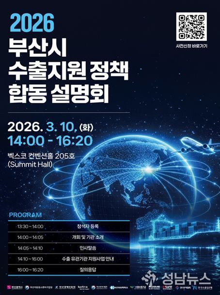 (성남뉴스) 부산시는 오늘(10일) 오후 2시 벡스코(BEXCO) 컨벤션홀 205호에서 '2026 부산 수출지원정책 합동설명회'를 개최한다고 밝혔다.