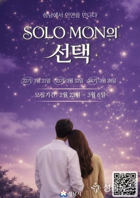 (성남뉴스) 성남시가 4년째 진행 중인 미혼 남녀 만남 행사 ‘솔로몬(SOLO MON)의 선택’ 인기가 여전한 것으로 나타났다.