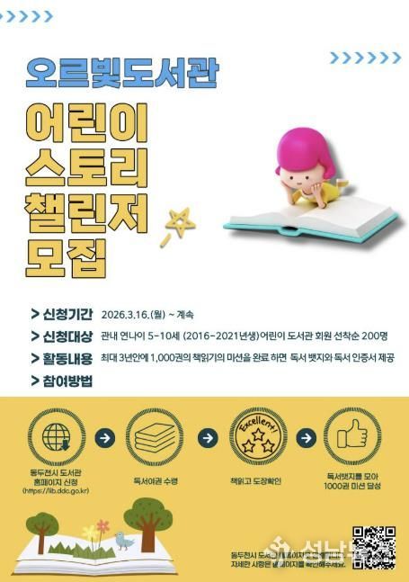 (성남뉴스) 동두천시 도서문화사업소는 3월 16일부터 관내 5-10세 어린이를 대상으로 ‘어린이 스토리 챌린저’ 참여자를 모집한다고 밝혔다. 이번 사업은 어린이의 자발적인 독서 습관 형성과 ‘책 읽는 동두천’ 분위기 조성 및 독서문화 확산을 위해 마련했다.