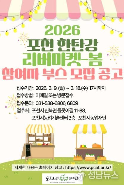 (성남뉴스) 포천시농업재단은 오는 5월 한탄강 생태경관단지에서 열리는 ‘2026년 포천 한탄강 리버마켓-봄’ 행사에 참여할 부스 운영자를 공개 모집한다.