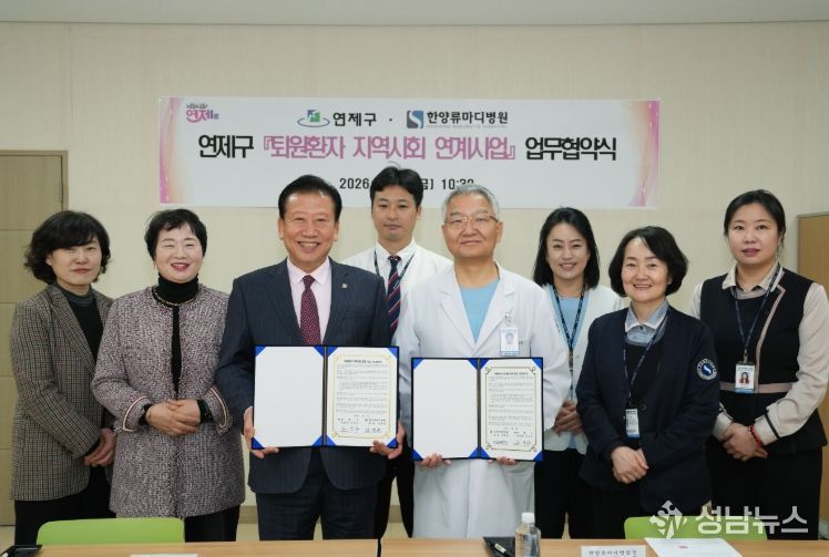 (성남뉴스) 연제구는 지난 3월 6일, 통합돌봄이 필요한 퇴원 환자의 원활한 지역사회 복귀를 지원하기 위해 한양류마디병원과 ‘퇴원환자 지역사회 연계사업’ 업무 협약을 체결했다고 밝혔다.
