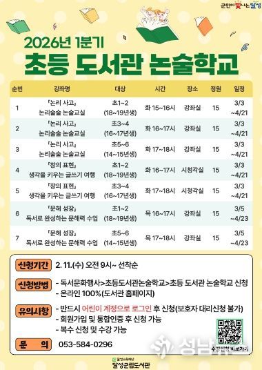 달성군립도서관은 이달부터 지역 주민을 위한 ‘2026년 1분기 평생학습 프로그램’과 초등학생의 문해력을 키워주는 ‘초등 도서관 논술학교’을 통해 총 14개 강좌를 운영 중이라고 밝혔다.