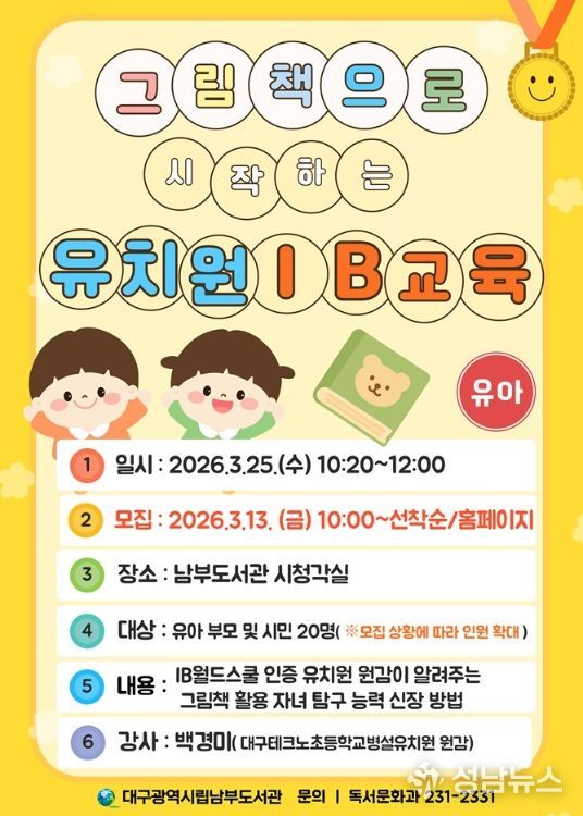 (성남뉴스) 대구시교육청 산하 남부도서관은 오는 3월 25일 유치원 학부모의 국제바칼로레아(IB) 교육에 대한 이해를 높이고, 가정에서 그림책을 활용한 탐구 활동을 실천할 수 있도록'그림책으로 시작하는 유치원 국제바칼로레아(IB) 교육' 특강을 운영한다.