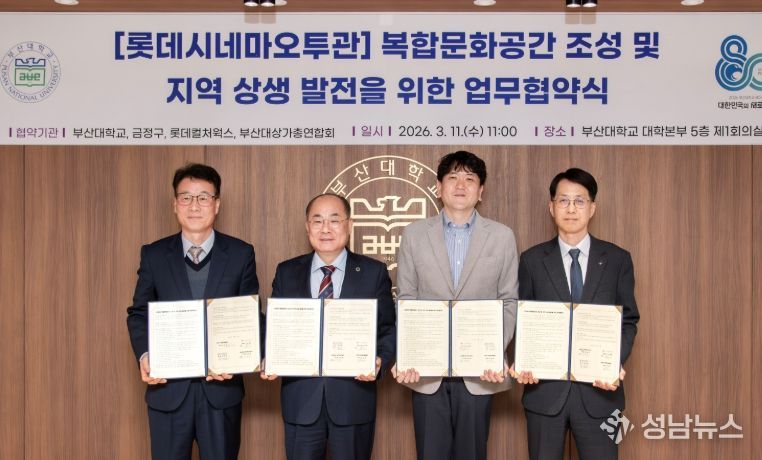 (성남뉴스) 부산 금정구는 지난 11일 부산대학교 본관 5층 제1회의실에서 부산대학교, 롯데컬처웍스, 부산대상가총연합회와 ‘오투관’ 복합문화공간 조성 및 지역 상생 발전을 위한 업무협약을 체결했다.