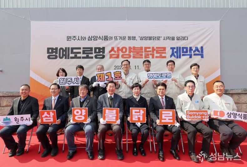 (성남뉴스) 원주시는 지난 11일 우산동 삼양식품 원주공장 인근에서 원주시 제1호 명예도로명인 ‘삼양불닭로’ 제막식을 열었다. 이날 행사에는 원강수 시장과 김정수 삼양식품 부회장, 김동찬 삼양식품 대표 등 관계자 30여 명이 참석했다.