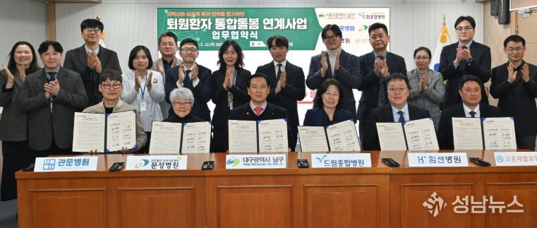 (성남뉴스) 대구 남구는 지난 12일 퇴원환자의 지역사회 성공적 복귀·안착을 돕기 위해 지역 내 병원 5개소와 “퇴원환자 통합돌봄 연계사업” 업무협약(MOU)을 체결했다.