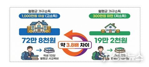 전국 가구 소득별 사교육비를 분석한 결과, 월평균 가구소득이 1,000만원 이상인 경우 학생 1인당 월평균 사교육비는 72만 8천원인 반면, 300만원 미만인 경우 19만 2천원으로 나타났다. 소득 구간에 따라 사교육비 부담이 약 3.8배 차이 나는 것으로 확인됐다.
