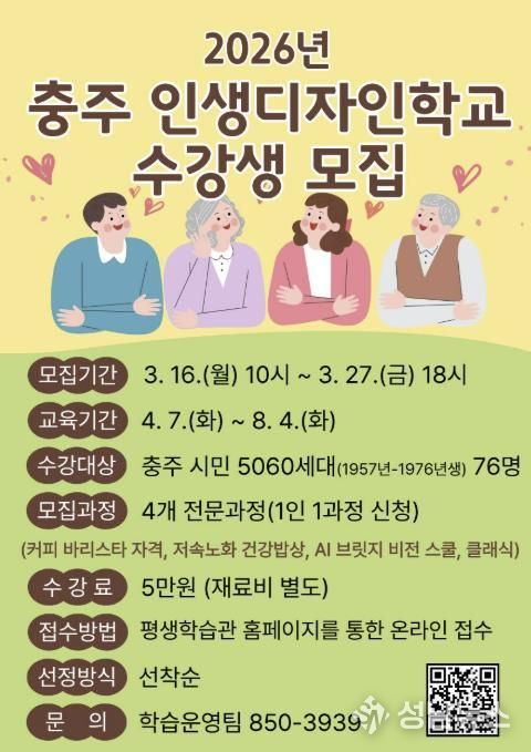 (성남뉴스) 충주시 평생학습관이 5060세대 시민의 인생 2막 설계를 지원하기 위해 ‘2026년 충주 인생디자인학교’ 수강생을 모집한다고 밝혔다.