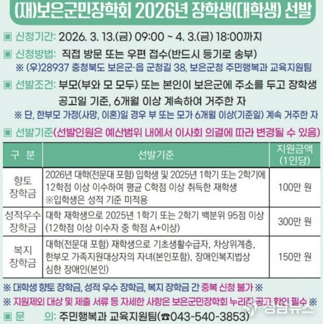 (성남뉴스) 재단법인 보은군민장학회는 지역 인재 육성과 교육 지원을 위해 2026년 대학생 장학생을 4월 3일까지 모집한다고 16일 밝혔다.