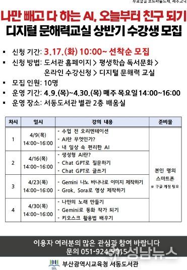 (성남뉴스) 부산광역시교육청서동도서관(관장 이진옥)은 오는 4월 9일부터 30일까지 매주 목요일 서동도서관 별관에서 지역 주민 10명을 대상으로 상반기 디지털 문해력 교실 ‘나만 빼고 다 하는 AI, 오늘부터 친구되기’를 운영한다.