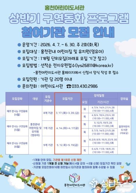 (성남뉴스) 홍천군은 영유아에게 그림책을 통해 정서적 안정 및 사회성 향상에 도움을 주며 책과 도서관을 가까이할 기회 제공을 위한 2026년 상반기 홍천 어린이도서관 '매주 만나는 구연동화' 프로그램 참여기관을 모집한다.