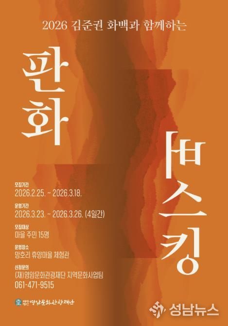 (성남뉴스) (재)영암문화관광재단은 오는 3월 23일부터 26일 4일간, 마을주민 대상으로 한 ‘2026 김준권 화백과 함께하는 판화버스킹’프로그램 참여자를 모집한다.