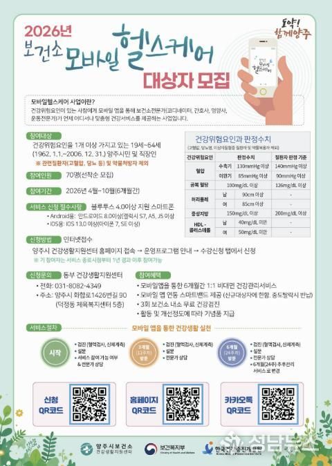 (성남뉴스) 양주시보건소 동부 건강생활지원센터가 스마트폰과 활동량계(스마트밴드)를 연동해 시공간의 제약 없이 맞춤형 건강관리를 지원하는 ‘2026년 보건소 모바일 헬스케어 사업’ 참여자를 16일부터 선착순 모집한다.