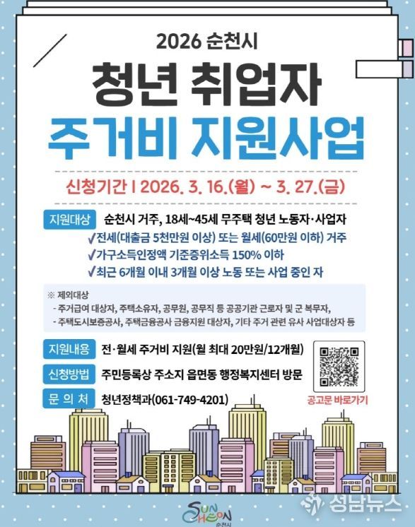 (성남뉴스) 순천시는 성실히 일하는 청년의 주거 안정과 경제적 자립 기반 마련을 위해'청년 취업자 주거비 지원사업' 대상자를 오는 27일까지 모집한다.