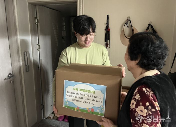 (성남뉴스) 다원 기부문화봉사단은 지난 15일, 동구 방촌동 일대 저소득 홀몸 어르신 세대를 직접 방문해 생필품 꾸러미 25상자(200만원 상당)를 전달했다.