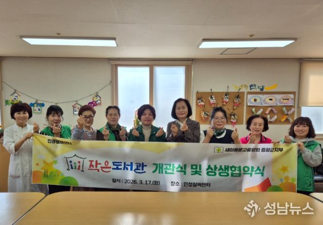 (성남뉴스) 새마을문고중앙회 증평군지부(회장 강미영)가 17일 인성실버센터에서 ‘새마을문고 작은도서관’개관식과 상생 협약식을 개최했다.