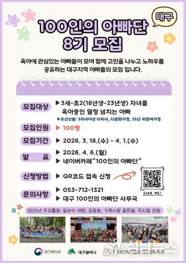 (성남뉴스) 대구광역시는 아빠들의 적극적인 육아 참여를 독려하고 함께 육아하는 사회 분위기를 확산하기 위해 3월 18일부터 ‘2026년 제8기 대구 100인의 아빠단’ 활동 단원을 모집한다.