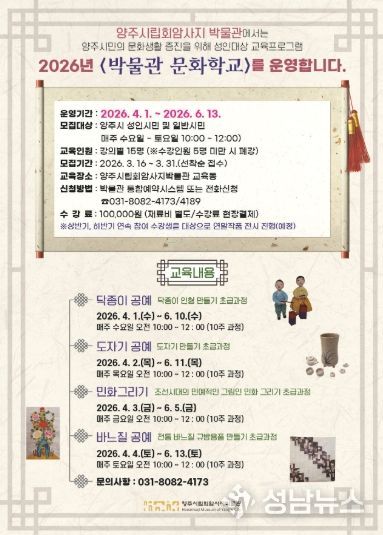 (성남뉴스) 양주시립회암사지박물관은 오는 3월 31일까지 시민들의 문화 향유 기회를 확대하고 문화예술 활동 참여를 활성화하기 위해 상반기 ‘2026 박물관 문화학교’ 수강생을 모집한다.