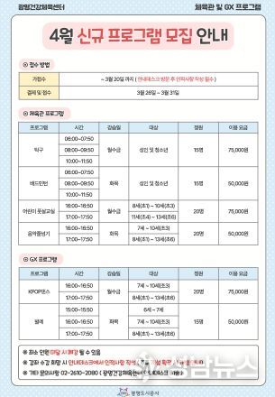 (성남뉴스) 광명도시공사는 광명건강체육센터에서 시민들의 건강 증진과 생활체육 활성화를 위해 체육관 및 GX실 4월 신규 프로그램 회원을 모집한다고 밝혔다.