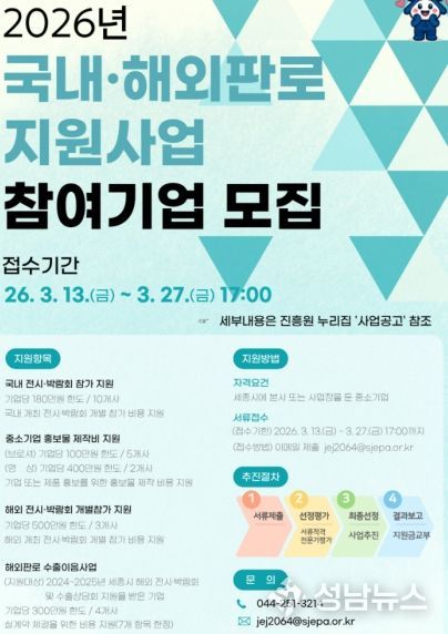 (성남뉴스) 세종일자리경제진흥원은 지역 중소기업의 판로 확대와 수출경쟁력 강화를 위해 ‘2026년 세종시 국내·해외판로 지원사업’ 참여기업을 모집한다고 밝혔다.