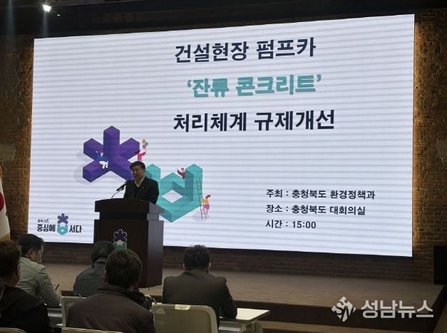 (성남뉴스) 충북도가 17일 건설·펌프카협회 및 시군 담당 공무원 등 100여 명이 참석한 가운데 ‘펌프카 잔류 콘크리트 처리체계 규제개선’ 설명회를 개최했다.
