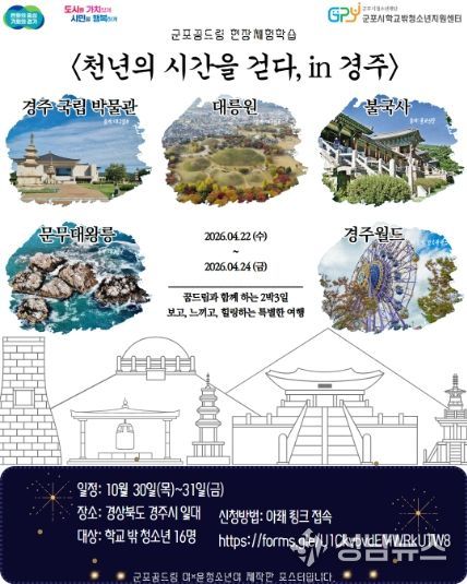 (성남뉴스) (재)군포시청소년재단(대표이사 김덕희) 군포시학교밖청소년지원센터(센터장 강연미)는 학교 밖 청소년 16명을 대상으로 오는 4월 22일부터 24일까지 2박 3일간 경상북도 경주시 일대에서 ‘역사캠프 현장체험학습 프로그램’을 운영한다고 밝혔다. 참가신청은 구글폼 등을 통해 접수 받은 뒤 신청 내용을 바탕으로 참여 대상자를 선정할 예정이다.