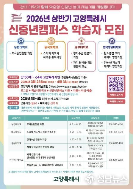 (성남뉴스) 고양특례시는 ‘2026년 고양시 신중년캠퍼스’ 상반기 교육과정 학습자 180명을 오는 3월 23일부터 모집한다.