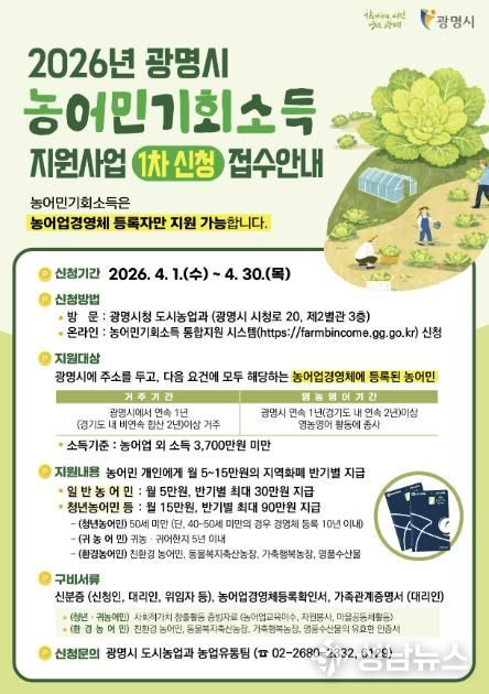 (성남뉴스) 광명시는 오는 4월 1일부터 4월 30일까지 ‘농어민 기회소득 지원사업 1차’ 신청을 받는다.