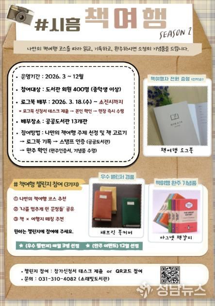 (성남뉴스) 시흥시도서관은 시민의 독서 실천을 지원하고 일상 속 독서문화를 확산하기 위해 3월 18일부터 ‘2026 시흥 책여행(시즌2)’ 로그북을 배부하고, ‘책여행 로그북 챌린지’를 함께 운영한다.