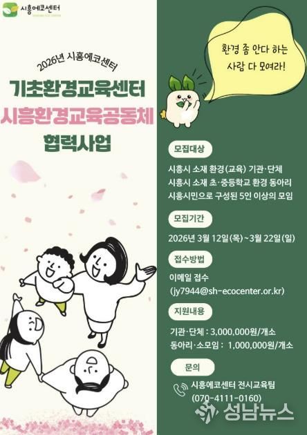 (성남뉴스) 시흥시는 지역 공동체 간 협력을 바탕으로 환경교육을 활성화하고, 환경교육 네트워크를 강화하기 위해 ‘2026년 기초환경교육센터-시흥환경교육공동체 협력사업’을 추진한다.