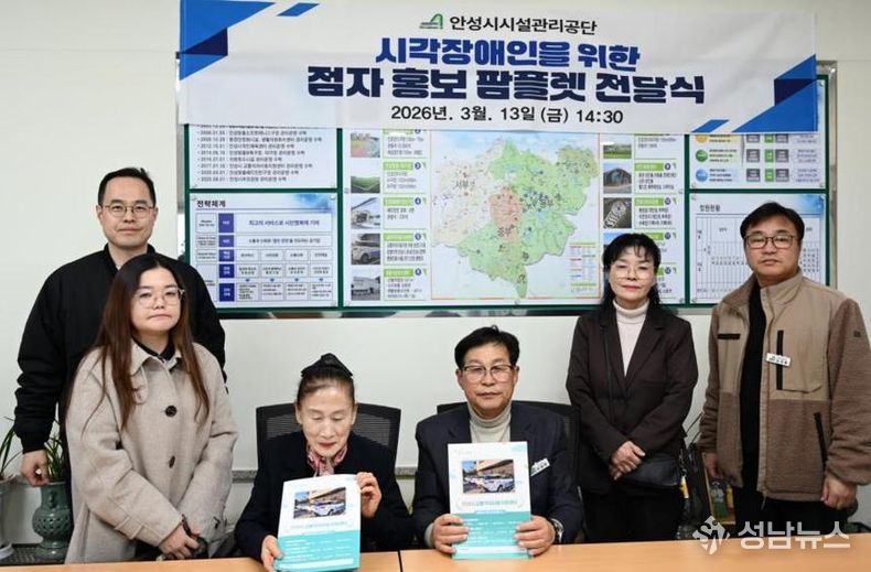 (성남뉴스) 안성시시설관리공단은 지난 13일 안성시 시각장애인협회에 시각장애인의 교통정보 접근성 향상을 위한 점자 홍보물(팜플렛)을 전달했다.