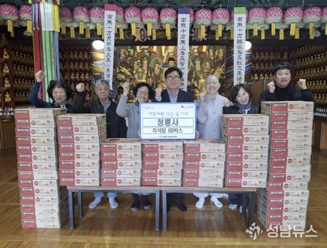 (성남뉴스) 가평 청룡사는 최근 지역의 소외된 이웃들에게 도움이 되길 바라는 마음으로 청평면 행정복지센터에 즉석밥 60박스를 기탁했다.