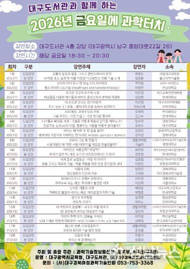 (성남뉴스) 대구도서관은 시민들에게 최신 과학기술과 연구 성과를 쉽고 흥미롭게 전달하기 위해 ‘2026년 금요일에 과학터치’ 프로그램을 본격 운영한다.