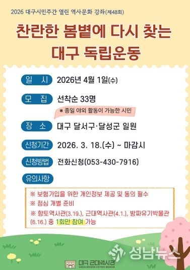 (성남뉴스) (재)대구문화예술진흥원 박물관운영본부 소속 대구근대역사관은 2026 대구시민주간 연계행사로 4월 1일 대구시 달서구와 달성군 일원의 대구 독립운동가와 문화유산을 찾아보는 ‘찬란한 봄볕에 다시 찾는 대구 독립운동’ 답사를 개최하며, 참가자를 모집한다.