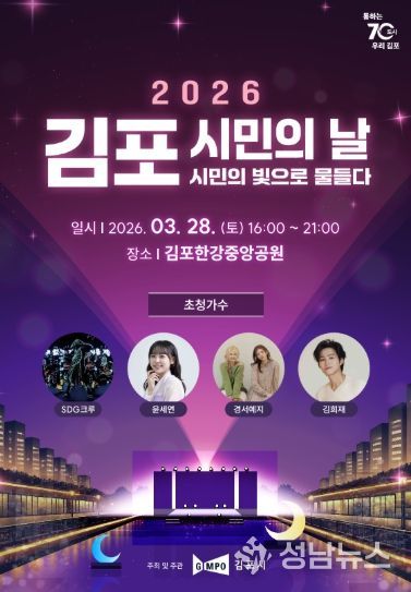 (성남뉴스) 김포시는 오는 3월 28일 김포한강중앙공원에서 ‘2026년 김포시민의 날 기념행사’를 개최한다고 밝혔다. 이번 행사는 김포시 시승격일(4월 1일)을 기념해 시민의 화합과 자긍심을 높이고, 시의 발전을 함께 기념하기 위해 마련됐다.