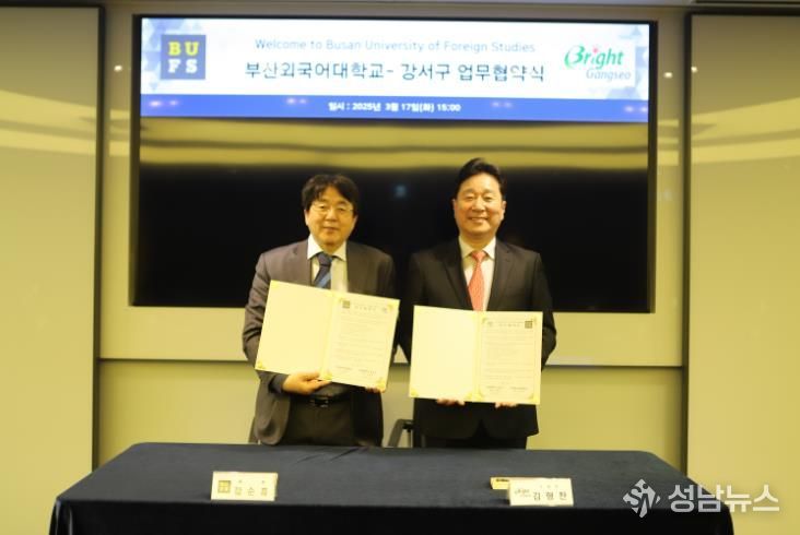 (성남뉴스) 부산 강서구는 3월 17일 부산외국어대학교 총장실에서 부산외국어대학교와 지역사회 교육 발전 및 관·학 협력 강화를 위한 업무협약(MOU)을 체결했다.