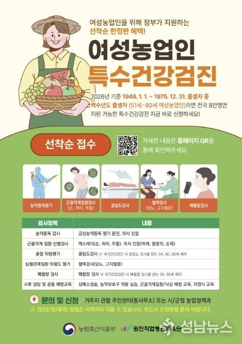 (성남뉴스) 태안군이 여성농업인의 질환 예방과 복지 증진을 위해 추진 중인 ‘특수건강검진 지원사업’의 원활한 신청을 위해 대상자의 적극적인 참여를 독려하고 나섰다.