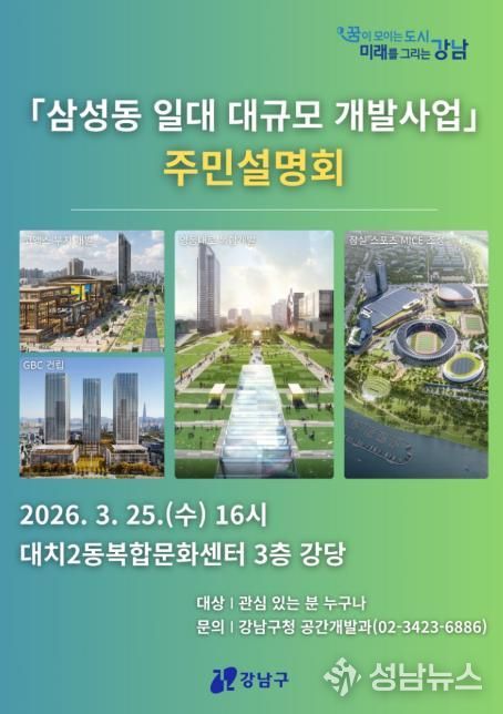 (성남뉴스) 꿈이 모이는 도시, 미래를 그리는 강남구가 오는 3월 25일 오후 4시, 대치2동복합문화센터 3층 강당에서 ‘삼성동 일대 대규모 개발사업 주민설명회’를 개최한다.