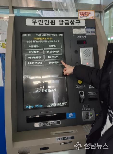 (성남뉴스) 서울 강북구는 주민들이 보다 편리하게 민원서류를 발급받을 수 있도록 관내 무인민원발급기 4개소에 가족관계등록사항별증명서 발급 서비스를 추가했다고 밝혔다.