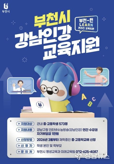 부천시는 2026년 ‘부천-런(Learn) 온라인 교육지원’ 사업을 추진한다고 19일 밝혔다. 이는 지난해에 이어 시행되는 것으로, 관내 중·고등학생들에게 온라인 교육 기회를 제공하고 가정의 사교육비 부담을 완화하는 데 중점을 둔다.