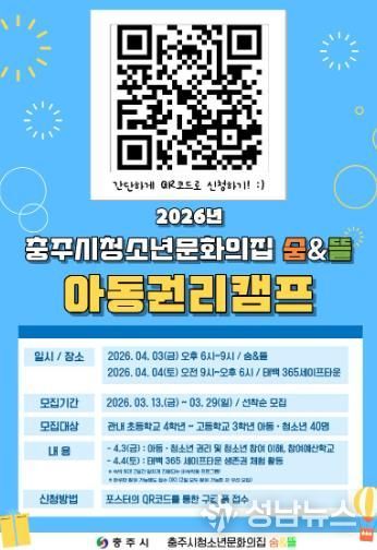 충주시청소년문화의집 숨&뜰은 오는 4월 3일부터 4일까지 아동 권리 보장을 위한‘2026년 아동권리캠프 프로그램’을 진행한다.