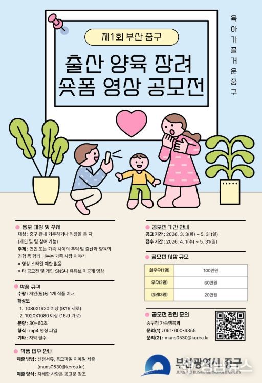 부산 중구는 출산과 양육의 긍정적인 가치를 확산하기 위해 제1회 '중구 출산·양육 장려 숏폼 영상 공모전'을 개최한다.