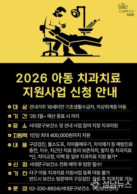 서대문구가 취약계층 아동의 구강건강을 위해 ‘아동 치과 치료 지원사업’을 확대 추진한다고 20일 밝혔다.