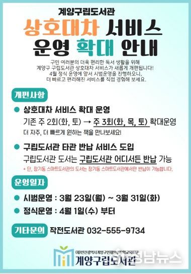 (재)인천광역시계양구인재양성장학교육재단 계양구립도서관은 오는 4월 1일부터 상호대차 서비스 운영을 확대하고, 타관 반납 서비스를 새롭게 도입한다.