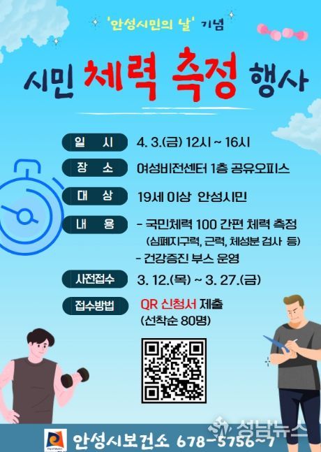 이번 행사는 오는 4월 3일 오후 12시부터 4시까지 안성시 여성비전센터 1층 공유오피스에서 진행된다. 현장에서는 체력 측정뿐만 아니라 심뇌혈관 질환 예방, 신체활동, 금연, 구강 관리 등 건강 인식 향상을 위한 다양한 건강증진 부스도 함께 운영될 예정이다.