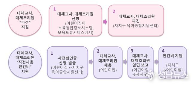 먼저 대체교사·대체조리원 파견 신청을 하고, 파견 지원이 어려운 경우엔 어린이집 직접채용 인건비 지원을 신청하면 된다.
