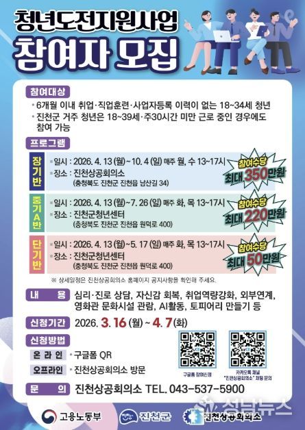 충북 진천군은 ‘2026년 청년도전지원사업’ 참여자를 모집한다고 밝혔다.