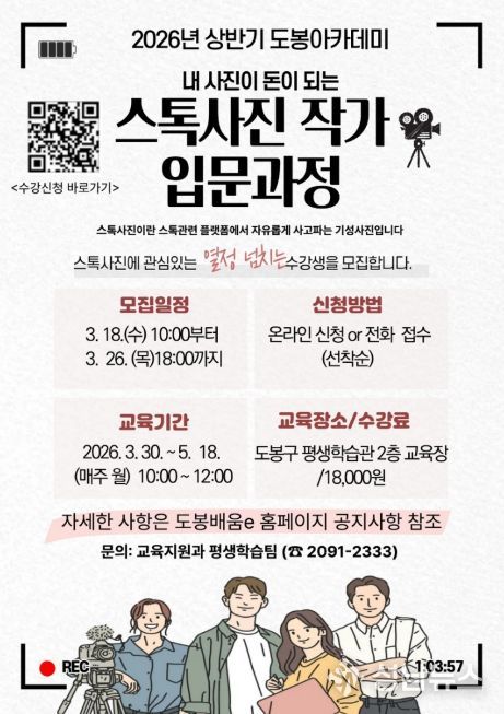 서울 도봉구가 오는 3월 30일부터 5월 18일까지 매주 월요일 도봉구 평생학습관 2층 대강의실에서 ‘스톡사진 작가 입문과정’을 운영한다고 밝혔다.