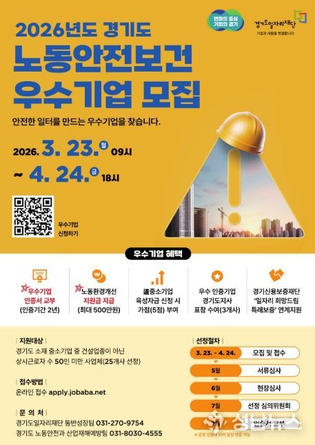 경기도와 경기도일자리재단은 산업재해 예방과 안전한 일자리 환경 조성을 위해 ‘2026년 경기도 노동안전보건 우수기업 인증사업’ 참여기업을 오는 4월 24일까지 모집한다.