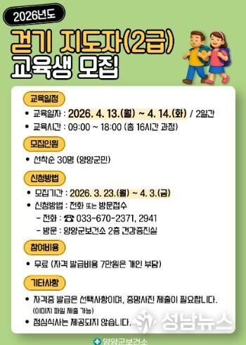 양양군보건소가 지역사회 내 자발적인 걷기 실천 분위기를 조성하고 주민 건강 지표를 개선하기 위해 ‘2026년 지역사회 걷기지도자(2급) 양성 과정’을 운영한다.
